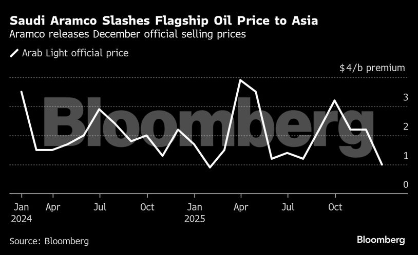 Η Σαουδική Αραβία μείωσε την τιμή του κύριου τύπου πετρελαίου της προς την Ασία για τον Δεκέμβριο στο χαμηλότερο επίπεδο των τελευταίων 11 μηνών, λίγες ημέρες μετά την ανακοίνωση της ΟΠΕΚ+ για αναστολή της αύξησης της προσφοράς για τις αρχές του επόμενου έτους.
