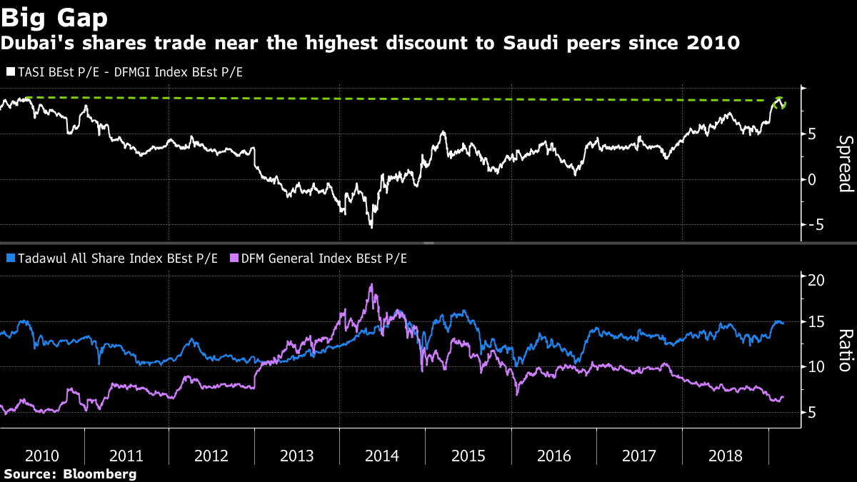 Οι μετοχές της Σαουδικής Αραβίας διαπραγματεύονται ιστορικά με ένα ασφάλιστρο στο Ντουμπάι, όσον αφορά τις εκτιμώμενες τιμές-κέρδος. Ωστόσο, το χάσμα μεταξύ τους έφτασε το μεγαλύτερο από το 2010 το Φεβρουάριο. Ο Γενικός Δείκτης Χρηματοπιστωτικής Αγοράς του Ντουμπάι ήταν ο χειρότερος επιτελεστικός σε παγκόσμιο επίπεδο πέρυσι μεταξύ σημαντικών μετρητών που παρακολουθήθηκαν από το Bloomberg, ενώ ο Σαουδάραβος ήταν μεταξύ των 10 καλύτερων. Ο κύριος δείκτης του Ντουμπάι υποχώρησε 0,1% στις 12:08 π.μ. τοπική ώρα, ενώ ο ομότιμος στη Σαουδική Αραβία ελάχιστα άλλαξε.