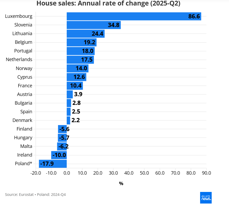 Στη Νορβηγία εκτός ΕΕ, οι πωλήσεις κατοικιών αυξήθηκαν κατά 10% κατά την περίοδο αυτή. Τα πιο πρόσφατα στοιχεία της Πολωνίας, από το τελευταίο τρίμηνο του 2024, δείχνουν ετήσια μείωση κατά 17,9%.
