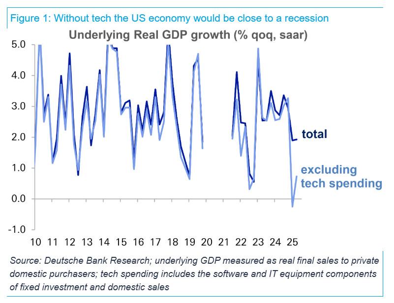 Σύμφωνα με την ανάλυσή του, χωρίς τις επενδύσεις στον τεχνολογικό τομέα — και ειδικά στον τομέα της AI — οι ΗΠΑ θα κινούνταν πολύ κοντά ή ακόμη και σε ύφεση φέτος. Αυτές οι επενδύσεις συνδέονται με ένα τεράστιο κύμα κεφαλαιουχικών δαπανών (capex boom) για την υποδομή της τεχνητής νοημοσύνης, και φαίνεται πως είναι το κλειδί σε πολλά από τα μακροοικονομικά παζλ της εποχής.