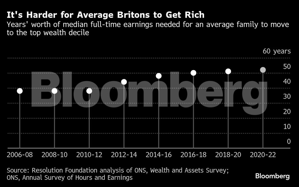 Σύμφωνα με νέα έκθεση του Resolution Foundation, ένας τυπικός υπάλληλος πλήρους απασχόλησης θα χρειαζόταν 52 χρόνια μισθών για να βρεθεί στην κορυφή της κατανομής του πλούτου το διάστημα 2020–2022, δηλαδή 14 χρόνια περισσότερα σε σχέση με το 2006–2008.