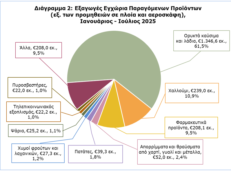 Οι εξαγωγές εγχώρια παραγόμενων προϊόντων, περιλαμβανομένων των προμηθειών πλοίων και αεροπλάνων, για τον Ιούλιο 2025 ήταν €384,1 εκ. σε σύγκριση με €217,4 εκ. τον Ιούλιο 2024, καταγράφοντας αύξηση 76,7%. Η αξία των εγχώριων εξαγωγών βιομηχανικών προϊόντων, εξαιρουμένων των προμηθειών πλοίων και αεροπλάνων, για τον Ιούλιο 2025 ανήλθε σε €373,8 εκ. σε σύγκριση με €208,6 εκ. τον Ιούλιο 2024.