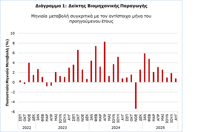 Ο Δείκτης Βιομηχανικής Παραγωγής για τον μήνα Αύγουστο 2025 έφθασε στις 91,1 μονάδες (βάση 2021=100), σημειώνοντας αύξηση 0,8% σε σύγκριση με τον Αύγουστο 2024, σύμφωνα με τα στοιχεία που δημοσίευσε σήμερα η Στατιστική Υπηρεσία.