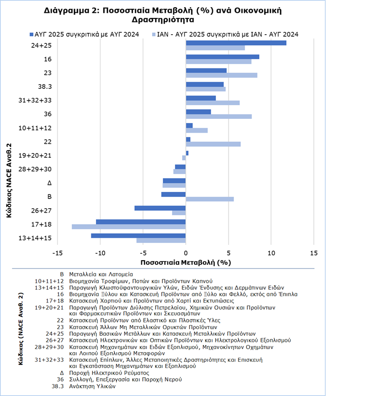 Συγκρίνοντας τους ρυθμούς μεταβολής για την περίοδο Ιανουαρίου – Αυγούστου 2025 με την αντίστοιχη περίοδο του προηγούμενου έτους, οι σημαντικότερες αυξήσεις παρατηρούνται στην κατασκευή άλλων μη μεταλλικών ορυκτών προϊόντων (+8,4%), στη συλλογή, επεξεργασία και παροχή νερού (+7,8%), στη βιομηχανία ξύλου και κατασκευή προϊόντων από ξύλο και φελλό, εκτός από έπιπλα (+7,7%).