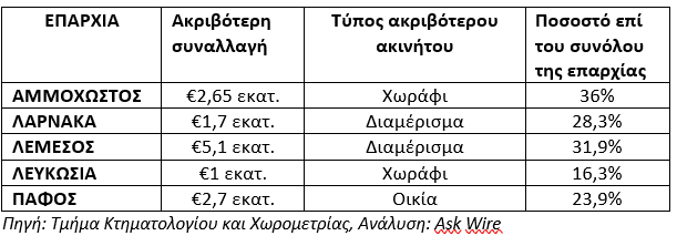 Στον κατάλογο των 10 ακριβότερων ακινήτων η επαρχία Λεμεσού μετρά πέντε συναλλαγές, η Πάφος τρεις και από μια συναλλαγή έκαστη οι επαρχίες ελεύθερης Αμμοχώστου και Λάρνακας.