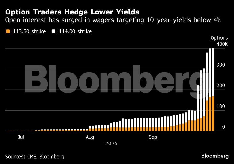 Μια εκ των συναλλαγών με ασφάλιστρο 35 εκατομμυρίων δολαρίων στοχεύει σε πτώση των αποδόσεων των 10ετών ομολόγων στο 4,05% περίπου πριν από τη λήξη των περισσότερων δικαιωμάτων προαίρεσης στις 21 Νοεμβρίου, από το 4,15% περίπου που είναι σήμερα. Η δραστηριότητα αυτή προστίθεται σε μια σειρά από bullish συναλλαγές που παρατηρήθηκαν στα 10ετή options την περασμένη εβδομάδα, με μία θέση να ανέρχεται σε περίπου 50 εκατομμύρια δολάρια, προβλέποντας πτώση έως και 3,95% την ίδια περίοδο. Αυτό θα έφερνε το επιτόκιο στα χαμηλότερα επίπεδα από τον Απρίλιο, όταν η αγορά βρισκόταν σε χάος λόγω των δασμών.