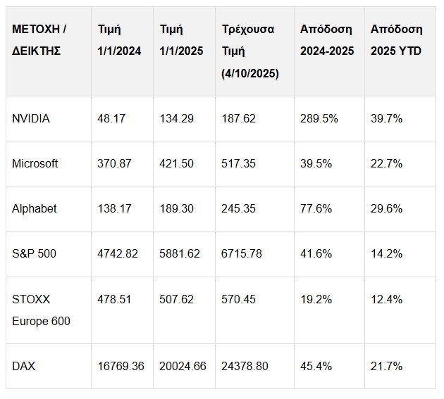 Όταν συγκρίνουμε αυτές τις επιδόσεις με τους παραδοσιακούς δείκτες, η διαφορά είναι τεράστια. Ο δείκτης S&P 500 έχει σημειώσει απόδοση μόνο 41,6% για την ίδια περίοδο, ενώ οι ευρωπαϊκοί δείκτες υστερούν σημαντικά: STOXX Europe 600 με 19,2% και DAX με 45,4%.