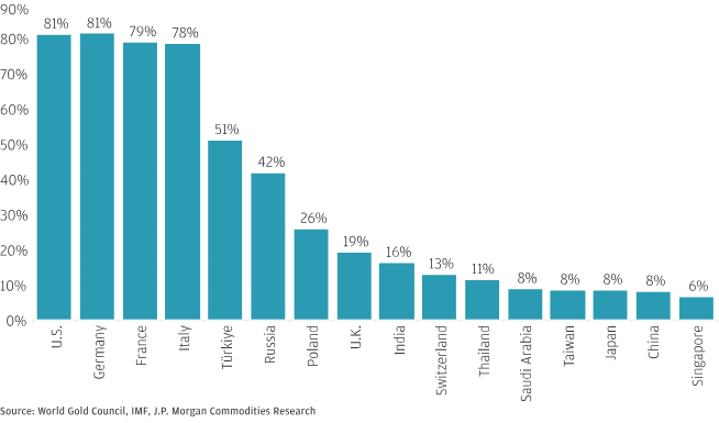 Η JP Morgan επισημαίνει ότι αν χώρες με ποσοστό χρυσού κάτω του 10% στα αποθεματικά τους αύξαναν το μερίδιο αυτό στο 10%, θα απαιτούνταν αγορές έως και 2.600 τόνων, ακόμη και με τιμές 4.000 δολαρίων ανά ουγγιά.