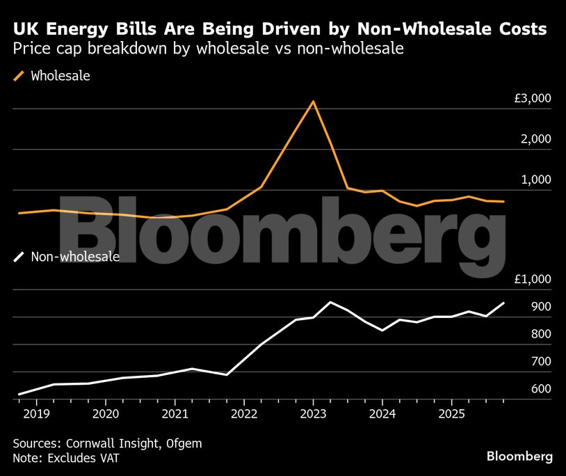 Σύμφωνα με την Cornwall Insight, οι οικιακοί λογαριασμοί ενέργειας – ήδη από τους ακριβότερους στην Ευρώπη – θα αυξηθούν ξανά έως τον Απρίλιο, εξαιτίας τελών δικτύου και επιβαρύνσεων πολιτικής, παρά τη μείωση των τιμών χονδρικής.