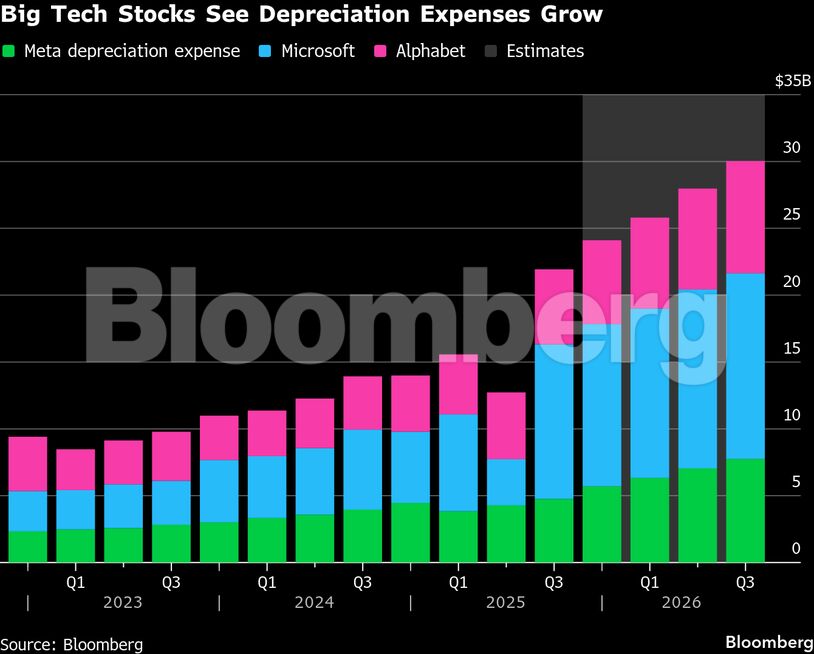 Η κερδοφορία των λεγόμενων «Magnificent Seven» αναμένεται να αυξηθεί κατά 18% το 2026, που αποτελεί τον χαμηλότερο ρυθμό των τελευταίων τεσσάρων ετών και μόλις οριακά καλύτερο από τον S&P 500. Την ίδια στιγμή, οι αποσβέσεις «εκτοξεύονται» από περίπου 10 δισ. δολάρια στο τέλος του 2023, έφτασαν τα 22 δισ. το τρίμηνο που έληξε τον Σεπτέμβριο και αναμένεται να αγγίξουν τα 30 δισ. δολάρια τον επόμενο χρόνο.