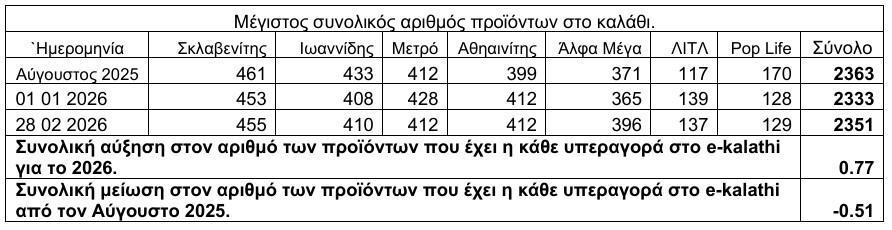 Στο τέλος Φεβρουαρίου 2026, σε σύγκριση με την 1η Ιανουαρίου 2026, παρατηρήθηκε μέση ανεπαίσθητη αύξηση 0,77% στον συνολικό αριθμό των προϊόντων που περιέχονται στο e-kalathi.