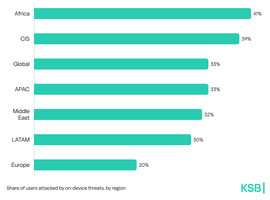 Το 33% των χρηστών δέχθηκε επιθέσεις από απειλές στη συσκευή. Σε αυτές περιλαμβάνονται κακόβουλα λογισμικά που διαδίδονται μέσω αφαιρούμενων μέσων (USB, CD, DVD) ή που αρχικά εισέρχονται στον υπολογιστή σε μη εκτελέσιμη μορφή (π.χ. προγράμματα μέσα σε σύνθετους installers, κρυπτογραφημένα αρχεία κ.ά.).