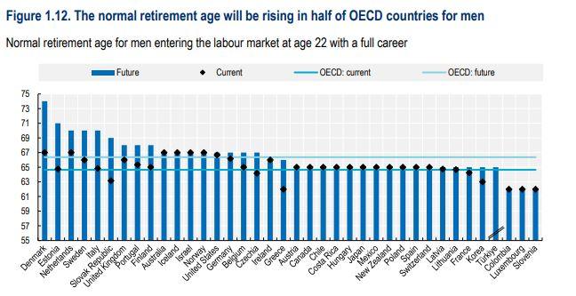 O ΟΟΣΑ γράφει συγκεκριμένα: «Η άλλη χώρα του ΟΟΣΑ με σύνδεση της ηλικίας συνταξιοδότησης με το προσδόκιμο ζωής είναι η Ελλάδα, αλλά η κανονική ηλικία συνταξιοδότησης στην Ελλάδα προβλέπεται να είναι ελαφρώς χαμηλότερη από τον μέσο όρο του ΟΟΣΑ στο μέλλον: αυτό οφείλεται στο γεγονός ότι η πρόωρη συνταξιοδότηση είναι δυνατή χωρίς κυρώσεις μετά από 40 χρόνια σταδιοδρομίας, επομένως είναι η ελάχιστη ηλικία, η οποία προβλέπεται να αυξηθεί από 62 σε 66 έτη, που καθορίζει τη μελλοντική κανονική ηλικία συνταξιοδότησης στην Ελλάδα».