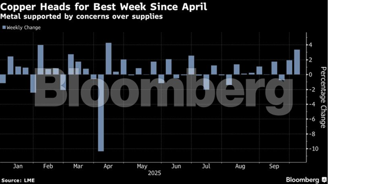Ο χαλκός οδεύει προς τη μεγαλύτερη εβδομαδιαία άνοδο από τον Απρίλιο — με τιμές περίπου 5% χαμηλότερες από το ρεκόρ που σημειώθηκε πέρυσι — καθώς οι διαταραχές στην προσφορά, η αποδυνάμωση του δολαρίου ΗΠΑ και ο αισιοδοξία σχετικά με τη ζήτηση στήριξαν τα κέρδη.