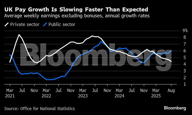 Το ποσοστό ανεργίας ανήλθε στο 4,8%, το υψηλότερο επίπεδο από τον Μάιο του 2021, ενώ οι αναλυτές ανέμεναν σταθερότητα. Παράλληλα, η αύξηση των μισθών στον ιδιωτικό τομέα υποχώρησε στο 4,4% για το τρίμηνο έως τον Αύγουστο – το χαμηλότερο ποσοστό από τα τέλη του 2021 και χαμηλότερο των προβλέψεων. Ωστόσο, η επίδοση παραμένει άνω του 3%, που θεωρείται συμβατή με τον στόχο πληθωρισμού 2% της Τράπεζας της Αγγλίας.