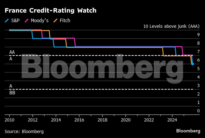 Η S&P Global Ratings υποβάθμισε τη Γαλλία, προκαλώντας ένα ακόμη πλήγμα στην αξιοπιστία της χώρας, καθώς η αποδυναμωμένη μειοψηφική κυβέρνηση αγωνίζεται να περάσει νομοθεσία για την αντιμετώπιση του αυξανόμενου χρέους.