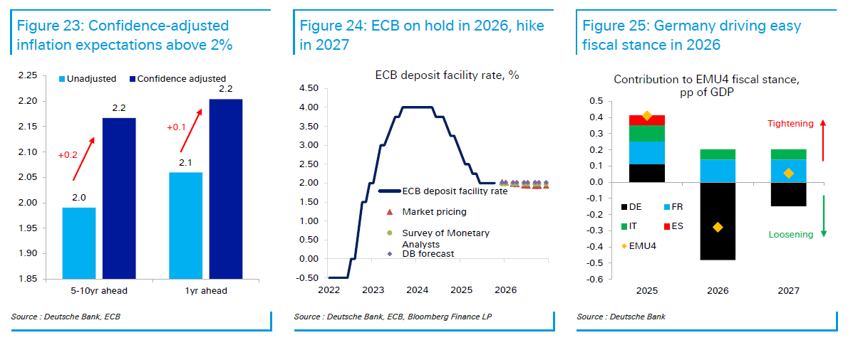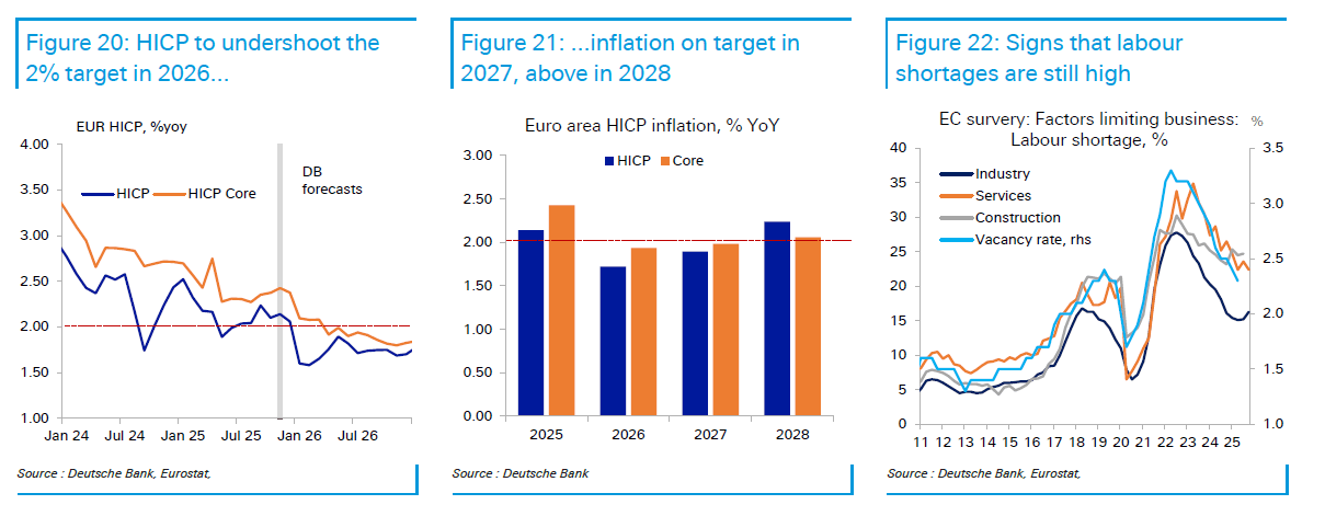 Για το 2026, η Deutsche Bank αναμένει ότι οι κίνδυνοι πληθωρισμού θα μετατραπούν από το να είναι κάτω από τον στόχο σε πιθανότητα υπερβάλλοντος πληθωρισμού. Η τράπεζα συνεχίζει να προβλέπει αύξηση των επιτοκίων της ΕΚΤ στο 2,50-2,75% το 2027-2028. Ωστόσο, με την ΕΚΤ να αναμένεται να ανέχεται κάποιες διακυμάνσεις του πληθωρισμού από τον στόχο και στις δύο κατευθύνσεις, η πρώτη αύξηση μπορεί να καθυστερήσει από το τέλος του 2026 στο μέσο του 2027.