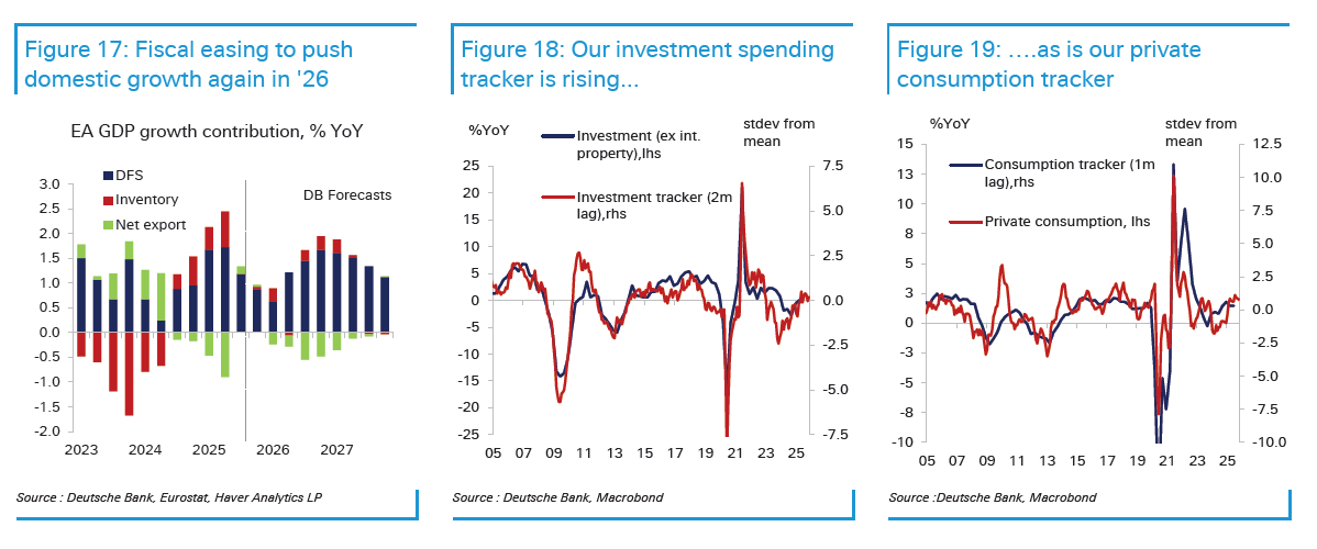 Παρά τις αδύναμες προοπτικές για ανάπτυξη αυτόν τον χειμώνα, η Deutsche Bank εκτιμά ότι η ανάπτυξη του ΑΕΠ στην περιοχή θα φτάσει το 1,1% το 2026. Η υποκείμενη δυναμική παραμένει πιο ισχυρή, με την ανάπτυξη του ΑΕΠ για το τέταρτο τρίμηνο του 2025 να προβλέπεται να επιταχυνθεί από το 1% στο 1,5% το 2026. Η μέση ανάπτυξη του ΑΕΠ για την περίοδο 2025-2027 αναμένεται να κυμανθεί στο 1,25%, συμβαδίζοντας ή ξεπερνώντας τις αναμενόμενες τάσεις.