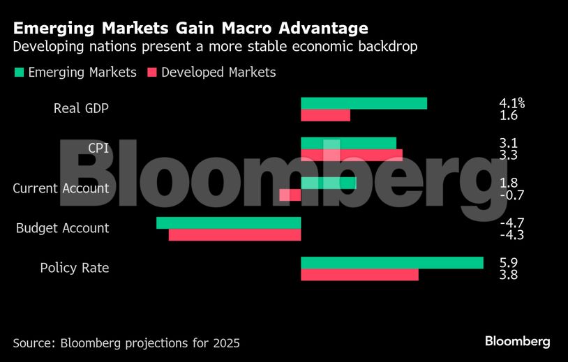 Το 2025 εξελίσσεται στην καλύτερη χρονιά για τα ομόλογα αναδυόμενων αγορών από την περίοδο πριν από την πανδημία. Στην αγορά κρατικών ομολόγων σε δολάριο, το επιπλέον premium που απαιτούν οι επενδυτές έναντι των αμερικανικών Treasuries υποχώρησε στο χαμηλότερο επίπεδο των τελευταίων επτά ετών. Για τους εκδότες με αξιολόγηση AA, το spread έφτασε σε ιστορικό χαμηλό στις 31 μονάδες βάσης, ενώ από τα τέλη του 2024, οι αποδόσεις σε τοπικό νόμισμα κινούνται κάτω από τα επιτόκια των ΗΠΑ.