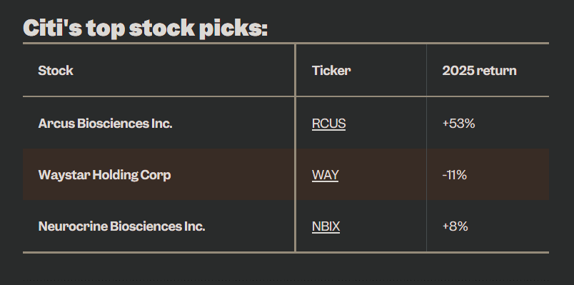 Η τράπεζα δήλωσε ότι αναμένει «μείωση της πολιτικής αβεβαιότητας» για την τόνωση του επενδυτικού κλίματος στον τομέα της υγειονομικής περίθαλψης, αναφερόμενη σε τάσεις όπως η μείωση της αβεβαιότητας σχετικά με τις τιμές των φαρμάκων, καθώς όλο και περισσότερες φαρμακευτικές εταιρείες συνάπτουν συμφωνίες με την κυβέρνηση Τραμπ.