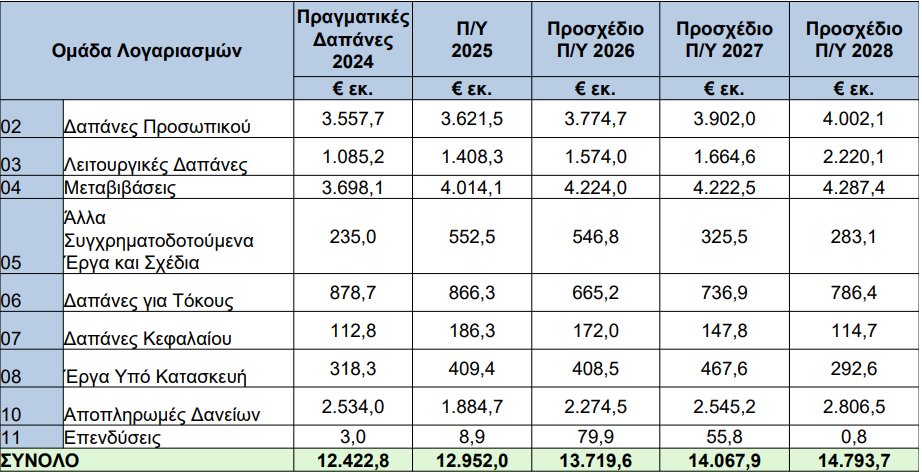Συγκεκριμένα οι δαπάνες προσωπικού προϋπολογίστηκαν στα 3,7 δισ. ευρώ για του χρόνου συγκριτικά με 3,6 δισ. ευρώ φέτος με τον συγκεκριμένο αριθμό – που εκτιμάται ότι περιλαμβάνει πέραν των μισθών και τις συντάξεις των δημοσίων υπαλλήλων- να προβλέπεται να ξεπεράσει ελαφρώς τα 4 δισ. ευρώ το 2028.