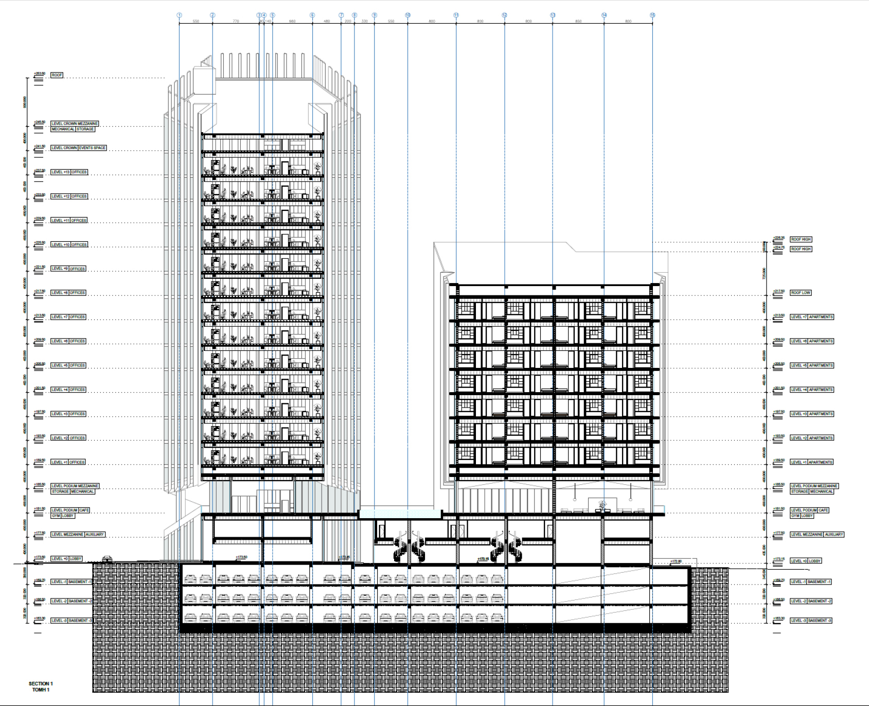 Το προτεινόμενο έργο θα αποτελείται από ισόγειο, επτά ορόφους και τρία υπόγεια.