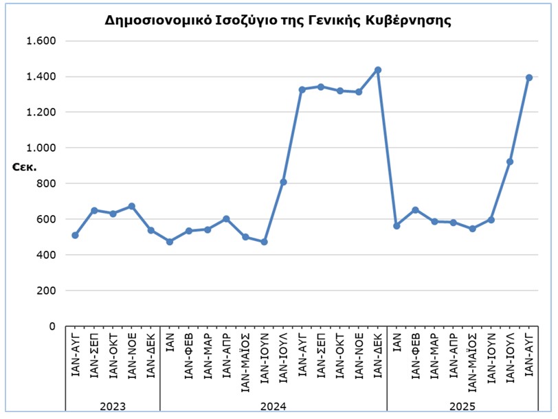 Τα προκαταρκτικά δημοσιονομικά αποτελέσματα που ετοιμάστηκαν από τη Στατιστική Υπηρεσία για την περίοδο Ιανουαρίου-Αυγούστου 2025 καταδεικνύουν πλεόνασμα της Γενικής Κυβέρνησης της τάξης των €1.395,7 εκ. (4,0% στο ΑΕΠ) σε σύγκριση με πλεόνασμα €1.328,9 εκ. (4,0% στο ΑΕΠ) για την περίοδο Ιανουαρίου-Αυγούστου 2024.