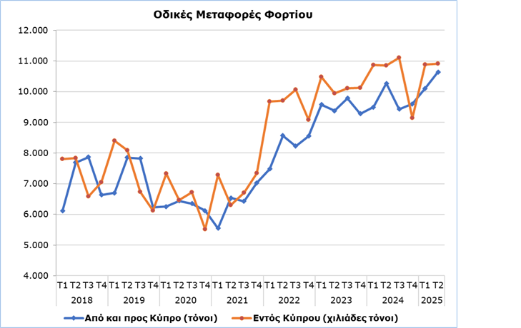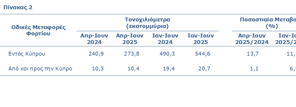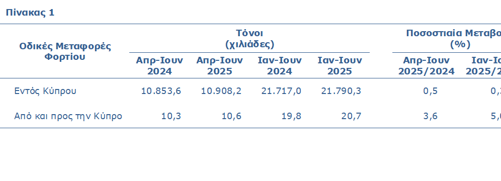 Κατά την περίοδο Ιανουαρίου-Ιουνίου 2025, το συνολικό βάρος των προϊόντων που μεταφέρθηκαν οδικώς εντός Κύπρου παρουσίασε αύξηση 0,3% σε σύγκριση με την αντίστοιχη περίοδο του 2024, ενώ το βάρος του φορτίου που μεταφέρθηκε οδικώς από και προς την Κύπρο επίσης σημείωσε αύξηση 5,0%.