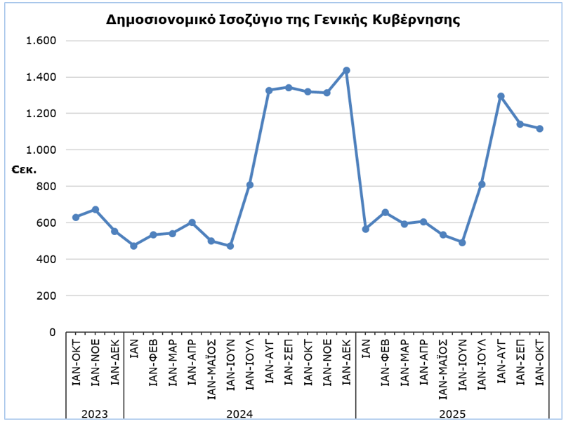 Οι συνολικές δαπάνες, κατά την περίοδο Ιανουαρίου-Οκτωβρίου 2025 αυξήθηκαν κατά €860,4 εκ. (+8,3%) και ανήλθαν στα €11.213,5 εκ. σε σύγκριση με €10.353,1 εκ. την αντίστοιχη περίοδο του 2024.