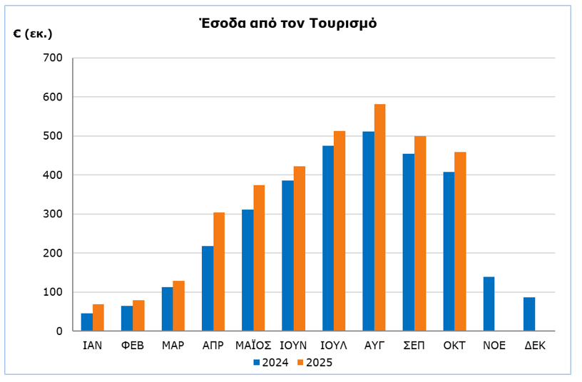 Για την περίοδο Ιανουαρίου-Οκτωβρίου 2025 τα έσοδα από τον τουρισμό υπολογίζονται σε €3.431,4 εκατ. σε σύγκριση με €2.983,8 εκατ. την αντίστοιχη περίοδο του 2024, σημειώνοντας αύξηση 15,0%.