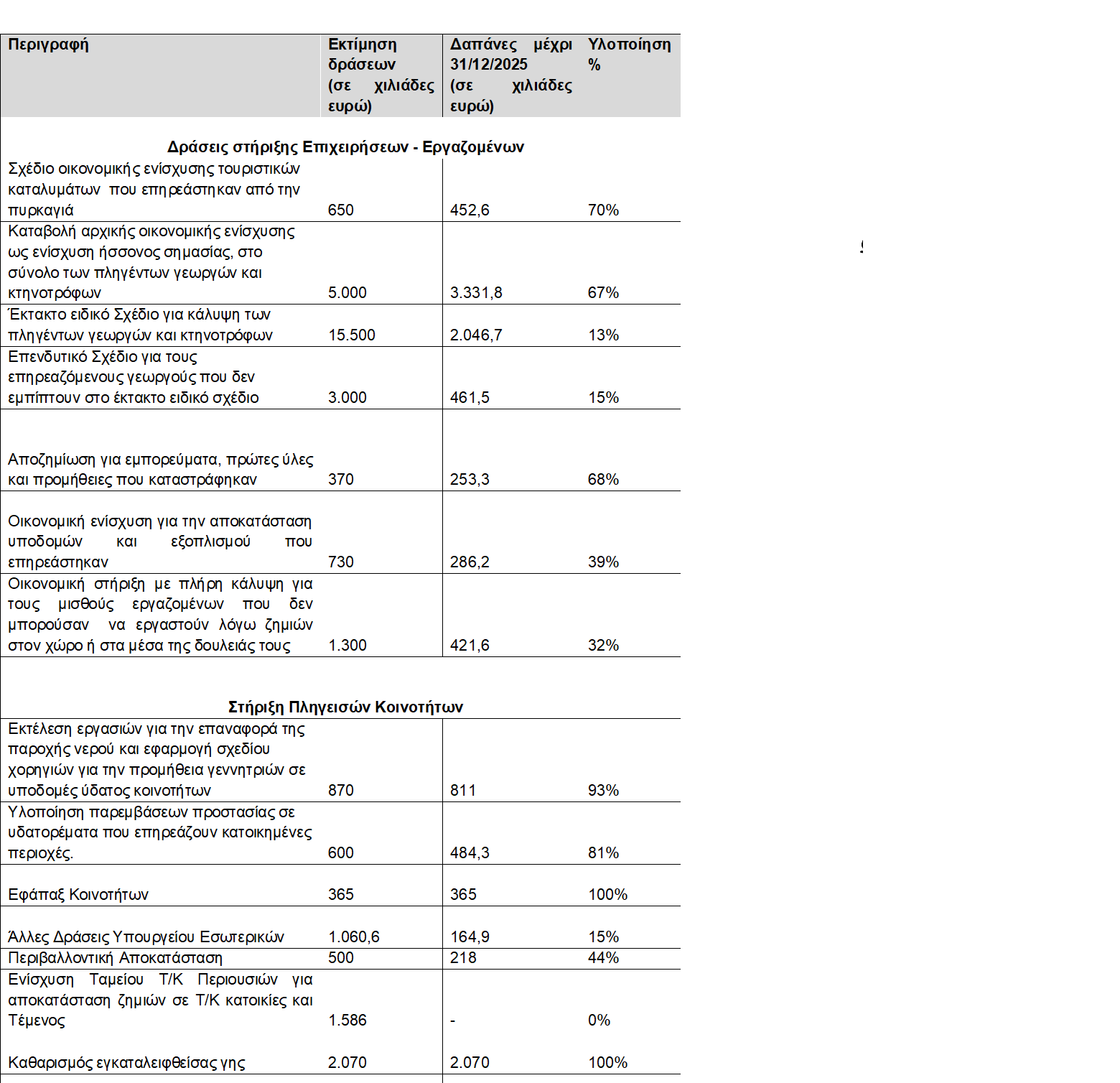 Ακολούθως, παρουσιάζεται ο απολογισμός υλοποίησης των ανωτέρω δράσεων.