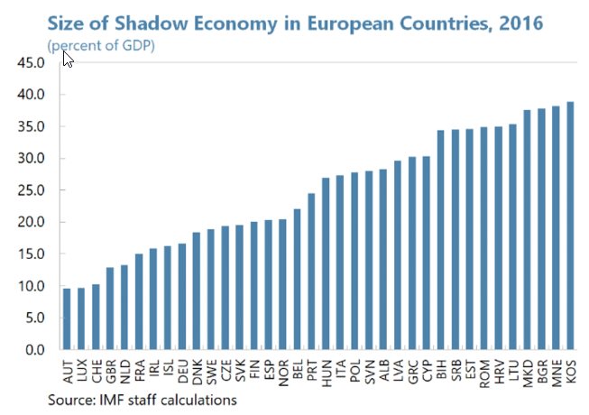 Χαρτογραφώντας το πρόβλημα στις ευρωπαϊκές χώρες, το ΔΝΤ σημειώνει ότι αυτό παρουσιάζει μεγάλο εύρος, καθώς εκτείνεται από λιγότερο από 10% μέχρι άνω του 40% ως ποσοστό του ΑΕΠ. Στις αναπτυγμένες ευρωπαϊκές χώρες η παραοικονομία διαμορφώνεται κατά μέσο όρο στο 10-20%, ενώ στις αναπτυσσόμενες, ο δείκτης σκαρφαλώνει στο 30-35%.