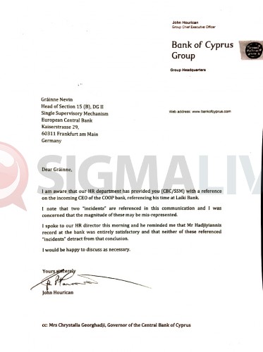Το ΣΙΓΜΑ εξασφάλισε και αποκαλύπτει την επίμαχη επιστολή. Η επιστολή Τζον Χούρικαν που κατέχει και παρουσιάζει το ΣΙΓΜΑ έχει ως αποδέκτη την Grainne Nevin, υψηλόβαθμο στέλεχος του Ενιαίου Εποπτικού Μηχανισμού της Ευρωπαϊκής Κεντρικής Τράπεζας, με κοινοποίηση στη Διοικήτρια της Κεντρικής Τράπεζας.