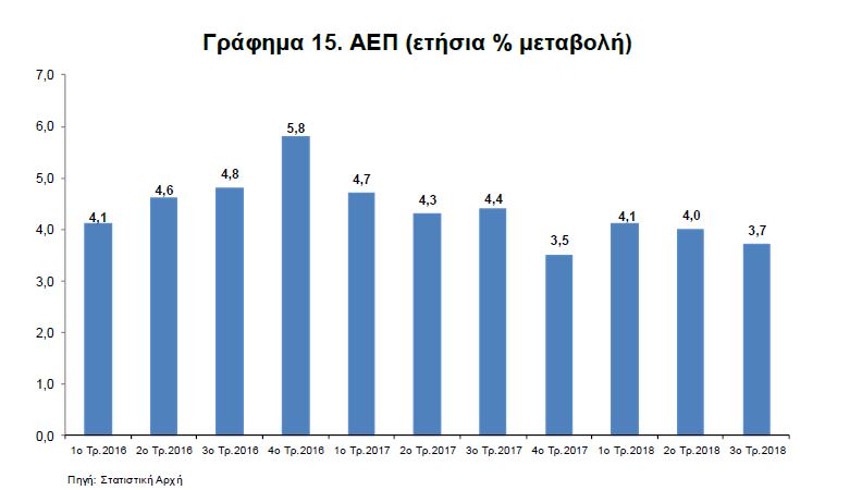 Σύμφωνα με το εβδομαδιαίο οικονομικό δελτίο της Alpha Bank και όπως διακρίνεται στο σχετικό Γράφημα (15), τα μη εποχικά διορθωμένα στοιχεία δείχνουν ότι το ΑΕΠ αυξήθηκε κατά 3,7%, σε ετήσια βάση, στο τρίτο τρίμηνο του 2018 από 3,9% στο δεύτερο τρίμηνο του 2018.