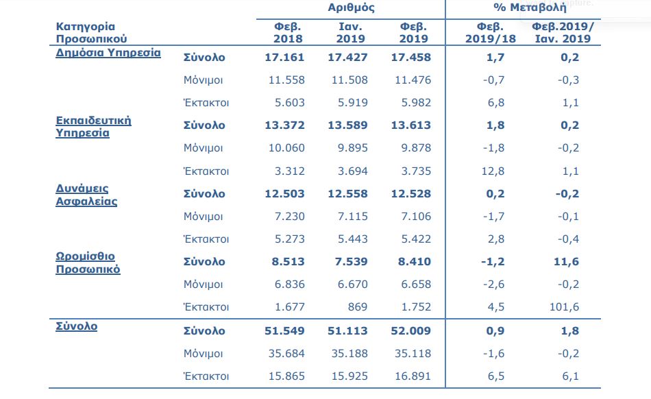 Όσον αφορά στο μόνιμο προσωπικό, εκεί παρατηρείται σημαντική μείωση κατά 566 άτομα, ήτοι -1,6%, ενώ αύξηση της τάξεως του 6,5% καταγράφει το έκτακτο προσωπικό φτάνοντας τις 16.891 σε σχέση με 15.865 τον αντίστοιχο μήνα του 2018.