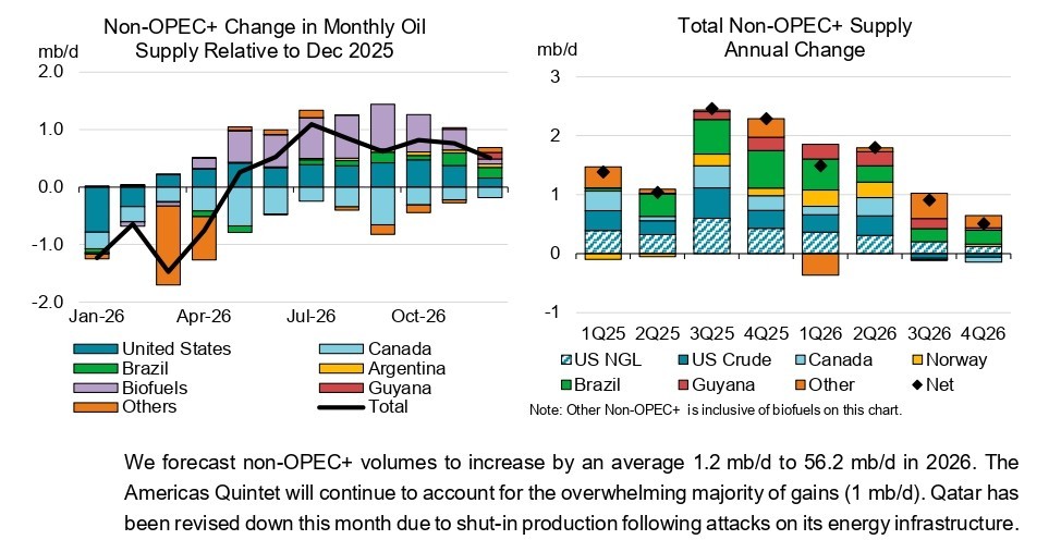 «Η παγκόσμια αύξηση της παραγωγής αργού πετρελαίου από το 2023 έχει προέλθει από χώρες εκτός ΟΠΕΚ+» ανέφερε σε ενημερωτικό της δελτίο η υπηρεσία ενημέρωσης του υπουργείου Ενέργειας των ΗΠΑ. «Στην έκθεση STEO του Δεκεμβρίου (του 2025), προβλέψαμε ότι η αύξηση της παραγωγής αργού πετρελαίου από τη Βραζιλία, τη Γουιάνα και την Αργεντινή ήταν 28% του παγκόσμιου συνόλου το 2025.»